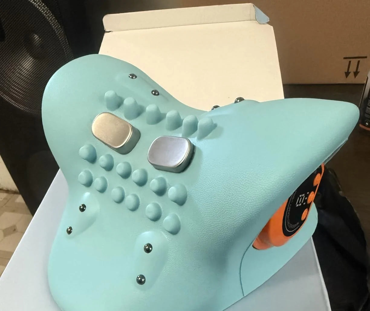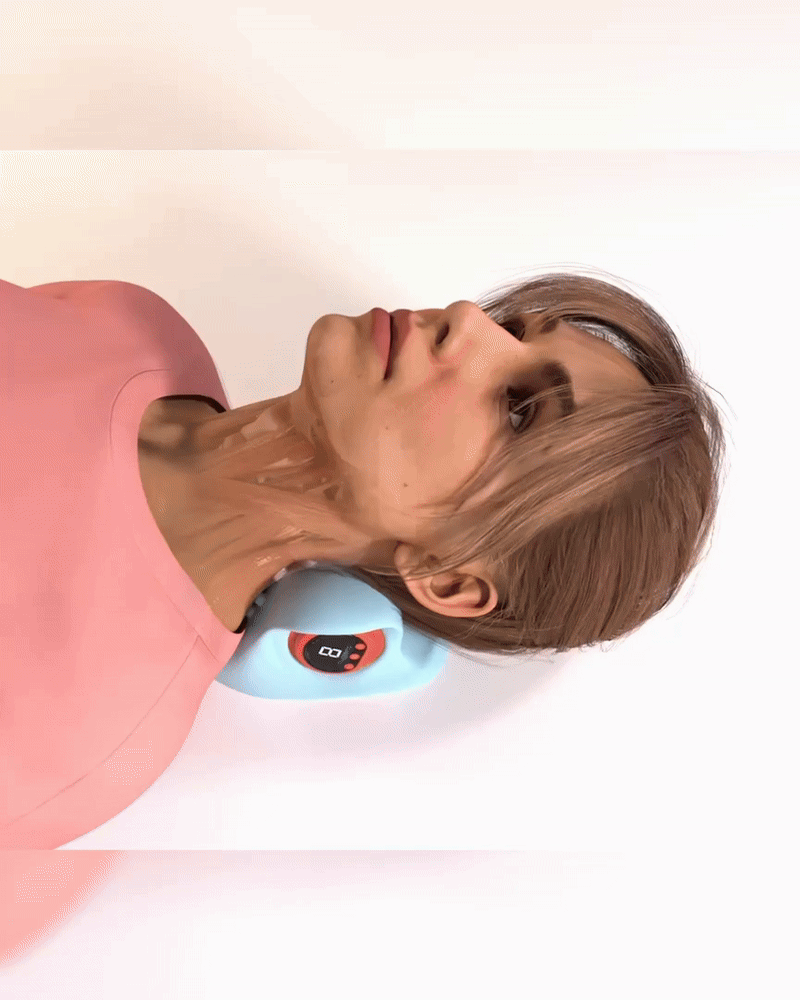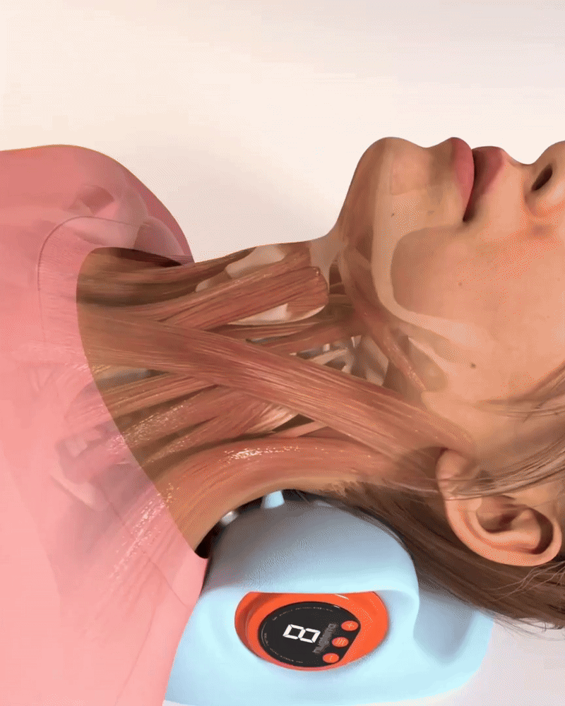 When you lay down on it, it stretches your neck at the perfect 26° angle, which is the most effective one when it comes to decompressing your spine. At the same time, the small electrical impulses force your muscles to contract, and act like pumps, naturally pushing blood through your neck & improving blood flow.